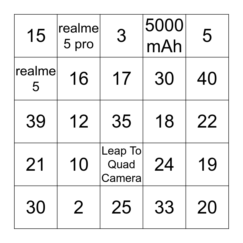 This bingo card has a free space and 29 words: 1, 2, 3, 4, 5, 15, 16, 17, 18, 19, 30, 12, 33, 20, 39, 9, 25, 24, 40, 21, 10, 38, 30, 22, realme 5, realme 5 pro, Leap To Quad Camera, 5000 mAh and Sd 665.