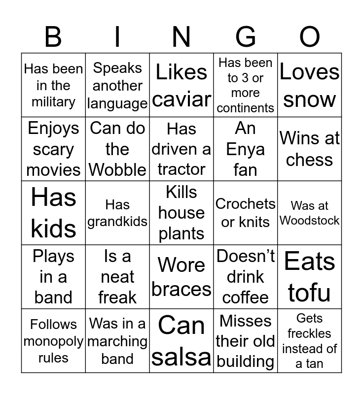 This bingo card has 30 words: Was in a marching band, Uses big words, Has grandkids, Has had surgery, Has been in the military, Likes caviar, Can do the Wobble, Wore braces, Crochets or knits, Can salsa, Was at Woodstock, Kills house plants, Misses their old building, Gets freckles instead of a tan, Wins at chess, Owns a yoga mat, Doesn’t drink coffee, Plays in a band, Is a neat freak, Loves snow, Has kids, Is a lefty, Speaks another language, An Enya fan, Enjoys scary movies, Has been to 3 or more continents, Eats tofu, Follows monopoly rules, Has driven a tractor and Doesn’t drink coffee.