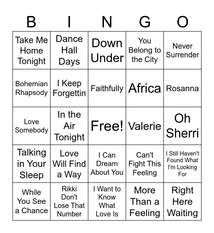 This bingo card has a free space and 40 words: Ride Like the Wind, Love Somebody, Really Want to Know, I Keep Forgettin, Rikki Don't Lose That Number, I Can Dream About You, Faithfully, Nothing's Going to Stop Us Now, Never Surrender, Talking in Your Sleep, In the Air Tonight, You Belong to the City, Right Here Waiting, Oh Sherri, Valerie, Love Will Find a Way, The Way It Is, Take Me Home Tonight, Sunglasses at Night, Down Under, I Still Haven't Found What I'm Looking For, More Than a Feeling, Africa, Bohemian Rhapsody, My Sharona, Dreams, Can't Get Enough of Your Love Babe, Don't Stop Til You Get Enough, Hold the Line, Somebody's Watching Me, Jack and Diane, While You See a Chance, Jesse's Girl, Can't Fight This Feeling, Rosanna, I Want to Know What Love Is, Money For Nothing, Who Can It Be Now, Dance Hall Days and Hold Me Now.