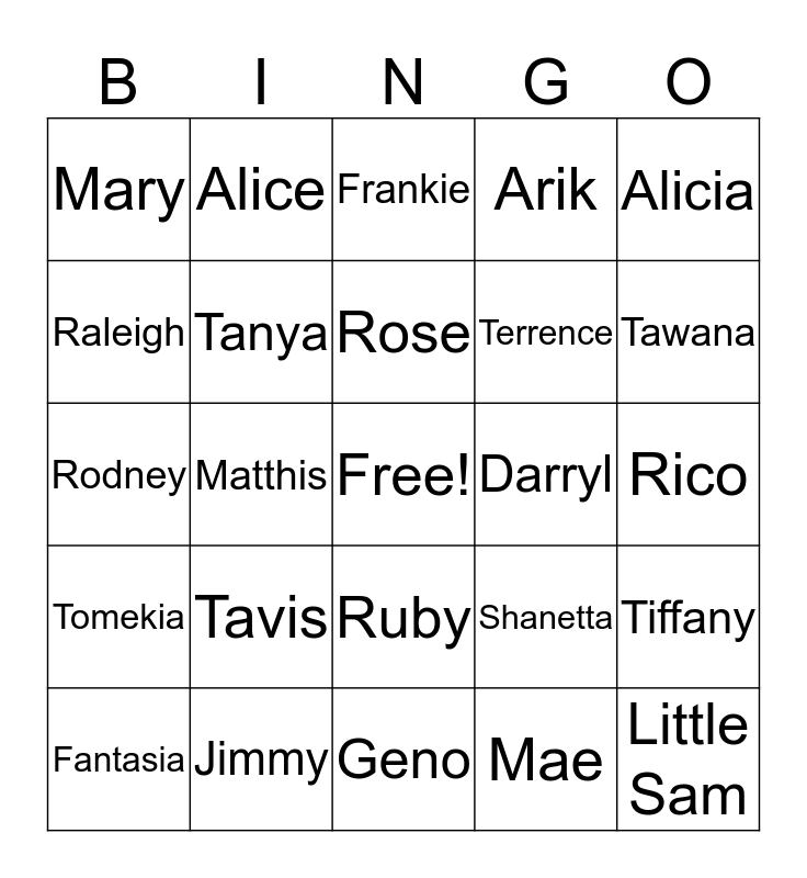 This bingo card has a free space and 34 words: Hattie, Mae, Tamara, Powell, Tomekia, Tanya, Alicia, Fantasia, Alice, Rebecca, Rose, Frankie, Jean, Sam, Darryl, Tawana, Jimmy, Rodney, Tavis, Shanetta, Ruby, Brenda, Mary, Rico, Geno, Little Sam, Arik, Justin, Terrence, Raleigh, Culp, Matthis, Tiffany and Orion.