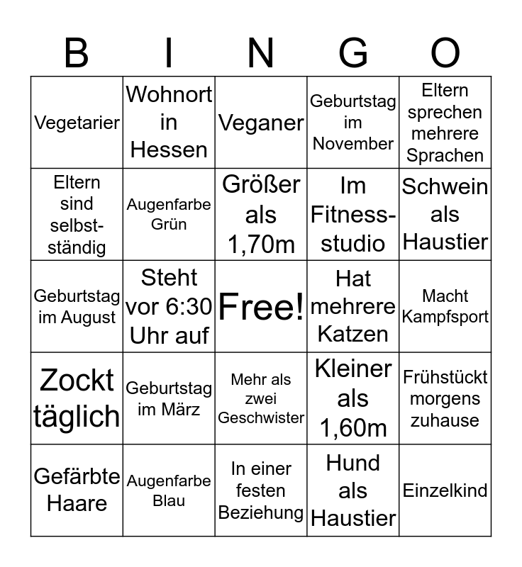 This bingo card has a free space and 24 words: Geburtstag im März, Augenfarbe Blau, Größer als 1,70m, Gefärbte Haare, Eltern sprechen mehrere Sprachen, Vegetarier, Eltern sind selbst-ständig, Wohnort in Hessen, Hat mehrere Katzen, Mehr als zwei Geschwister, Im Fitness-studio, Geburtstag im August, Kleiner als 1,60m, Frühstückt morgens zuhause, Augenfarbe Grün, Hund als Haustier, Macht Kampfsport, Veganer, Schwein als Haustier, Steht vor 6:30 Uhr auf, Einzelkind, Zockt täglich, Geburtstag im November and In einer festen Beziehung.