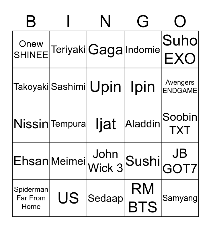 This bingo card has 25 words: Meimei, Sedaap, Upin, Spiderman Far From Home, Suho EXO, Onew SHINEE, Takoyaki, Teriyaki, Aladdin, John Wick 3, Ipin, Nissin, Sushi, JB GOT7, Sashimi, Samyang, Soobin TXT, Gaga, Avengers ENDGAME, Tempura, Ijat, US, Ehsan, Indomie and RM BTS.