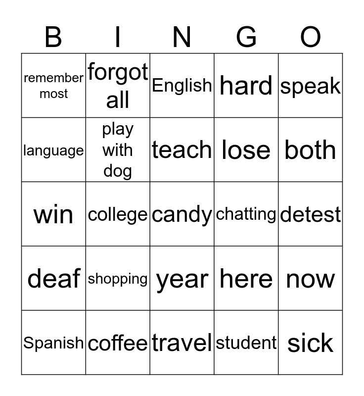This bingo card has a free space and 29 words: Spanish, hearing, college, start, remember most, English, play with dog, shopping, chatting, coffee, detest, sick, travel, student, both, easy, year, deaf, speak, win, here, Gallaudet University, lose, language, hard, forgot all, now, teach and class.