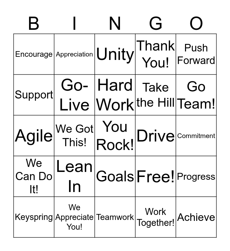 This bingo card has 25 words: Lean In, Teamwork, Hard Work, Keyspring, Push Forward, Encourage, Support, Appreciation, Drive, Goals, Take the Hill, Agile, Free!, Progress, Go-Live, Achieve, Commitment, Unity, Go Team!, We Got This!, You Rock!, We Appreciate You!, We Can Do It!, Thank You! and Work Together!.