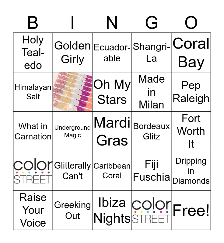 This bingo card has 5 images and 29 words: Free!, Coral Bay, Raise Your Voice, Golden Girly, Interstellar, Oh My Stars, Ecuador-able, Tokyo Lights, Moon River, Bordeaux Glitz, Pep Raleigh, Greeking Out, What in Carnation, Glitterally Can't, Fiji Fuschia, Caribbean Coral, Havana Honey, Holy Teal-edo, Fort Worth It, Ibiza Nights, Mardi Gras, Shangri-La, Only in Vegas, Made in Milan, Himalayan Salt, Nuclear Fuchsian, Underground Magic, Dripping in Diamonds and Northern Wonder.