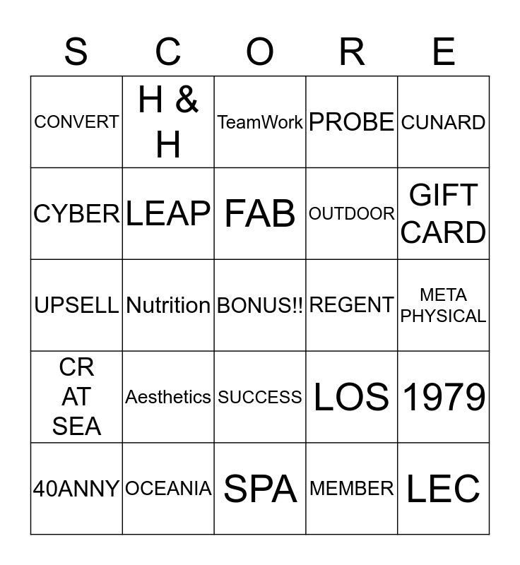 This bingo card has a free space and 24 words: 40ANNY, Aesthetics, FAB, MEMBER, CUNARD, CONVERT, H & H, TeamWork, REGENT, META PHYSICAL, UPSELL, LEAP, LOS, 1979, CYBER, OCEANIA, SPA, PROBE, GIFT CARD, CR AT SEA, Nutrition, SUCCESS, OUTDOOR and LEC.