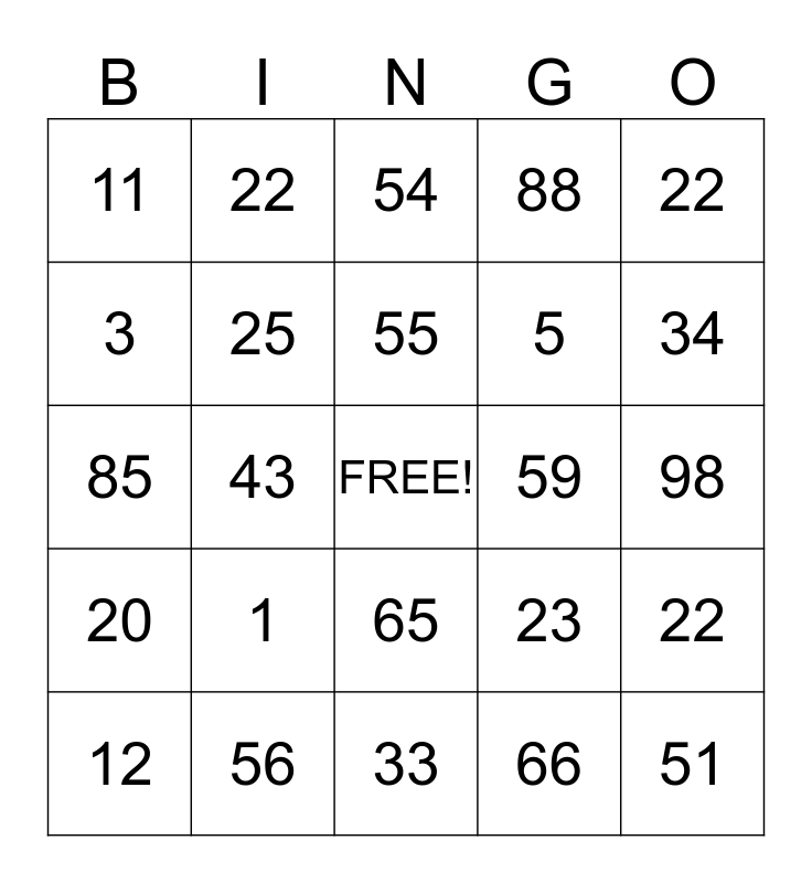 This bingo card has a free space and 24 words: 1, 56, 55, 12, 22, 11, 3, 22, 59, 65, 5, 85, 23, 22, 25, 66, 98, 54, 34, 43, 51, 20, 88 and 33.