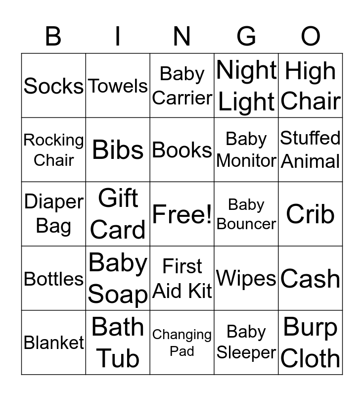 This bingo card has a free space and 34 words: Baby Booties, Baby Sleeper, Pacifier, Teether, Bottles, Bibs, High Chair, Blanket, Towels, Diapers, Books, Baby Carrier, Stroller, Car Seat, Baby Bouncer, Stuffed Animal, Bath Tub, Diaper Bag, Baby Soap, Wipes, First Aid Kit, Diaper Rash Ointment, Socks, Crib, Changing Pad, Burp Cloth, Night Light, Air Planes, Baby Monitor, Rocking Chair, Gift With "Maxin" On It, Gift Card, Cash and Baby Proofing Items.