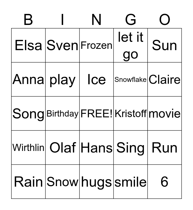 This bingo card has a free space and 24 words: Olaf, Snow, Ice, Rain, Sun, Elsa, Anna, Sven, Kristoff, Hans, Snowflake, Song, Sing, Run, play, smile, movie, Frozen, Claire, Birthday, 6, Wirthlin, let it go and hugs.