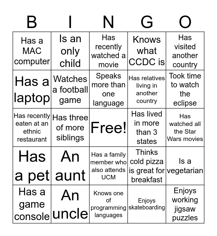 This bingo card has a free space and 24 words: An aunt, An uncle, Speaks more than one language, Has a game console, Has visited another country, Has a MAC computer, Has a laptop, Is an only child, Has lived in more than 3 states, Has a family member who also attends UCM, Has relatives living in another country, Has recently eaten at an ethnic restaurant, Thinks cold pizza is great for breakfast, Is a vegetarian, Watches a football game, Enjoys skateboarding, Has watched all the Star Wars movies, Has recently watched a movie, Took time to watch the eclipse, Has three of more siblings, Enjoys working jigsaw puzzles, Has a pet, Knows what CCDC is and Knows one of programming languages.