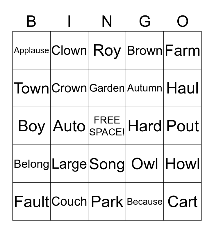 This bingo card has a free space and 49 words: Barnyard, Cart, Armful, Park, Large, Growl, Clown, Gown, Town, Down, Crown, Brown, Howl, Owl, Towel, Star, Garden, Hard, Barn, Farm, Auto, Because, Applause, Autumn, Hauling, Haul, Fault, August, Song, Belong, Strong, Along, Pout, Sound, Couch, Cloud, Found, Ouch, Pout, Shout, Loud, House, Mouth, Toy, Boy, Roy, Royal, Joy and Enjoy.