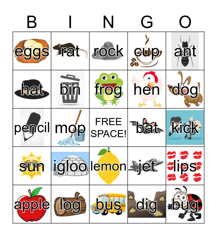 This bingo card has 24 images, a free space and 24 words: igloo, log, frog, apple, ant, eggs, hat, rat, bat, lemon, hen, pencil, jet, lips, bin, dig, kick, rock, dog, mop, bug, sun, cup and bus.
