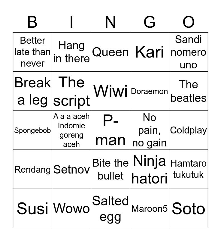 This bingo card has a free space and 24 words: Setnov, Wowo, Wiwi, Susi, Sandi nomero uno, Better late than never, Break a leg, Hang in there, No pain, no gain, Bite the bullet, Doraemon, Spongebob, Ninja hatori, Hamtaro tukutuk, The script, Maroon5, Coldplay, Queen, The beatles, A a a aceh Indomie goreng aceh, Soto, Rendang, Kari and Salted egg.