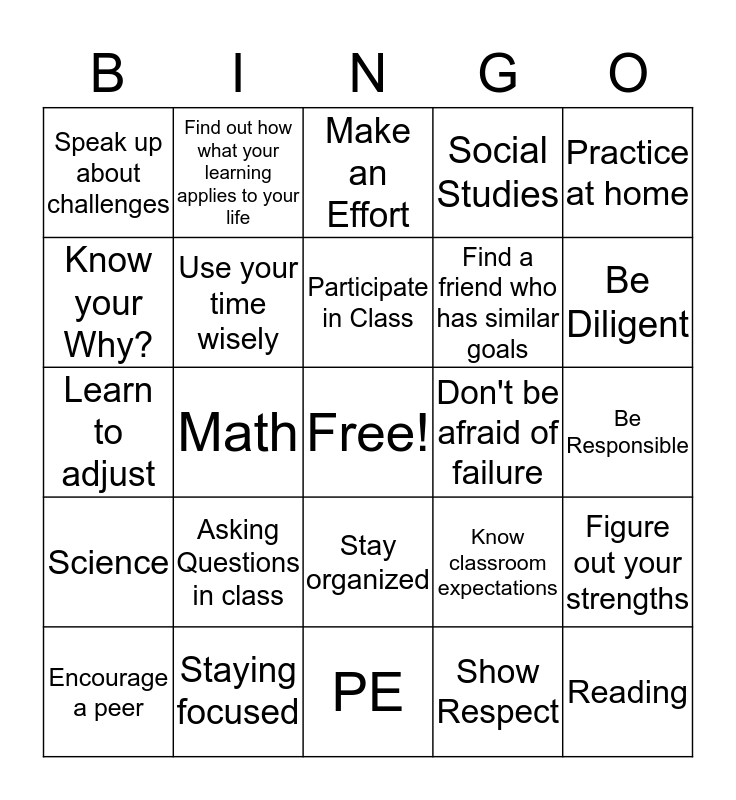 This bingo card has a free space and 24 words: Asking Questions in class, Staying focused, Participate in Class, Encourage a peer, Practice at home, Speak up about challenges, Know your Why?, Find out how what your learning applies to your life, Don't be afraid of failure, Stay organized, Find a friend who has similar goals, Learn to adjust, Know classroom expectations, Figure out your strengths, Use your time wisely, Show Respect, Be Responsible, Make an Effort, Be Diligent, Math, Reading, Science, Social Studies and PE.