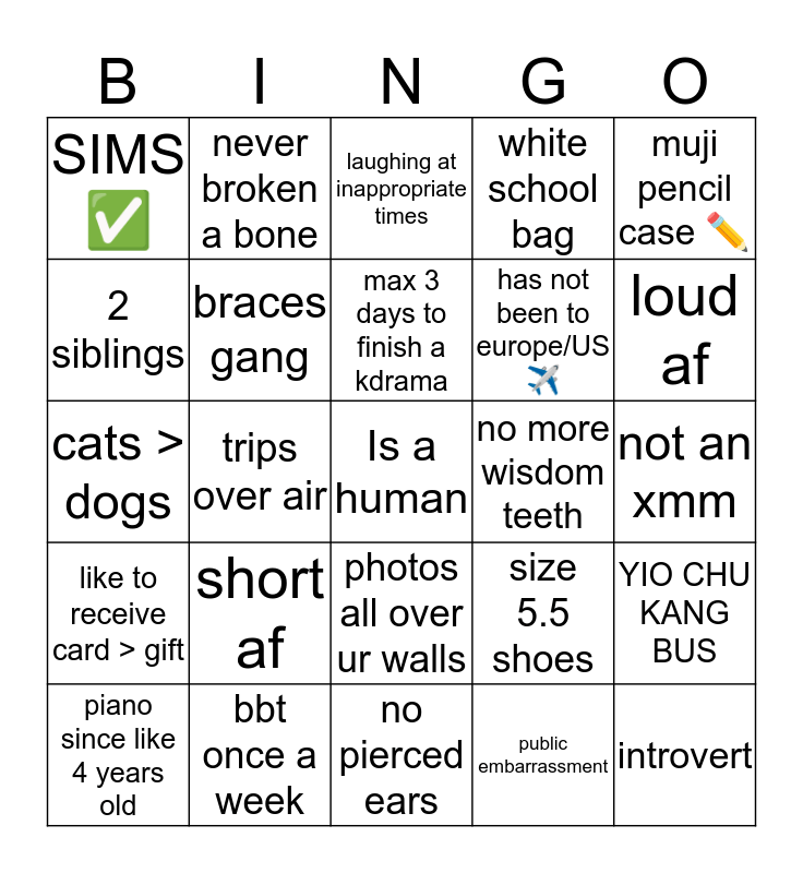 This bingo card has a free space and 24 words: short af, bbt once a week, max 3 days to finish a kdrama, piano since like 4 years old, muji pencil case ✏️, SIMS ✅, 2 siblings, never broken a bone, no more wisdom teeth, photos all over ur walls, has not been to europe/US ✈️, cats > dogs, size 5.5 shoes, YIO CHU KANG BUS, braces gang, public embarrassment, not an xmm, laughing at inappropriate times, loud af, trips over air, introvert, like to receive card > gift, white school bag and no pierced ears.