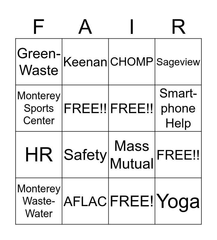 This bingo card has 16 words: AFLAC, FREE!!, CHOMP, Green-Waste, HR, Keenan, Mass Mutual, FREE!, Monterey Sports Center, FREE!!, Monterey Waste-Water, Sageview, Safety, Smart- phone Help, FREE!! and Yoga.