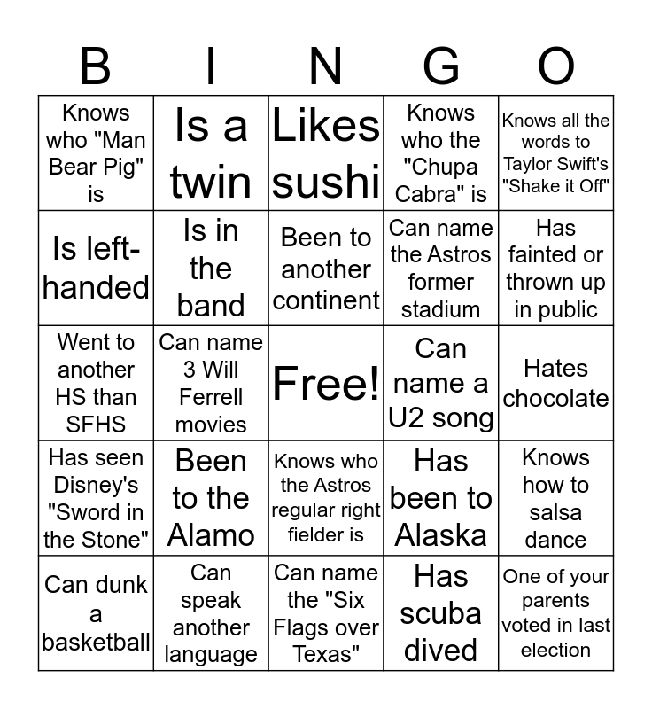 This bingo card has a free space and 24 words: Been to the Alamo, Can speak another language, Been to another continent, Can dunk a basketball, Knows all the words to Taylor Swift's "Shake it Off", Knows who "Man Bear Pig" is, Is left-handed, Is a twin, Can name a U2 song, Knows who the Astros regular right fielder is, Can name the Astros former stadium, Went to another HS than SFHS, Has been to Alaska, Knows how to salsa dance, Is in the band, Has scuba dived, Hates chocolate, Likes sushi, Has fainted or thrown up in public, Can name 3 Will Ferrell movies, One of your parents voted in last election, Has seen Disney's "Sword in the Stone", Knows who the "Chupa Cabra" is and Can name the "Six Flags over Texas".
