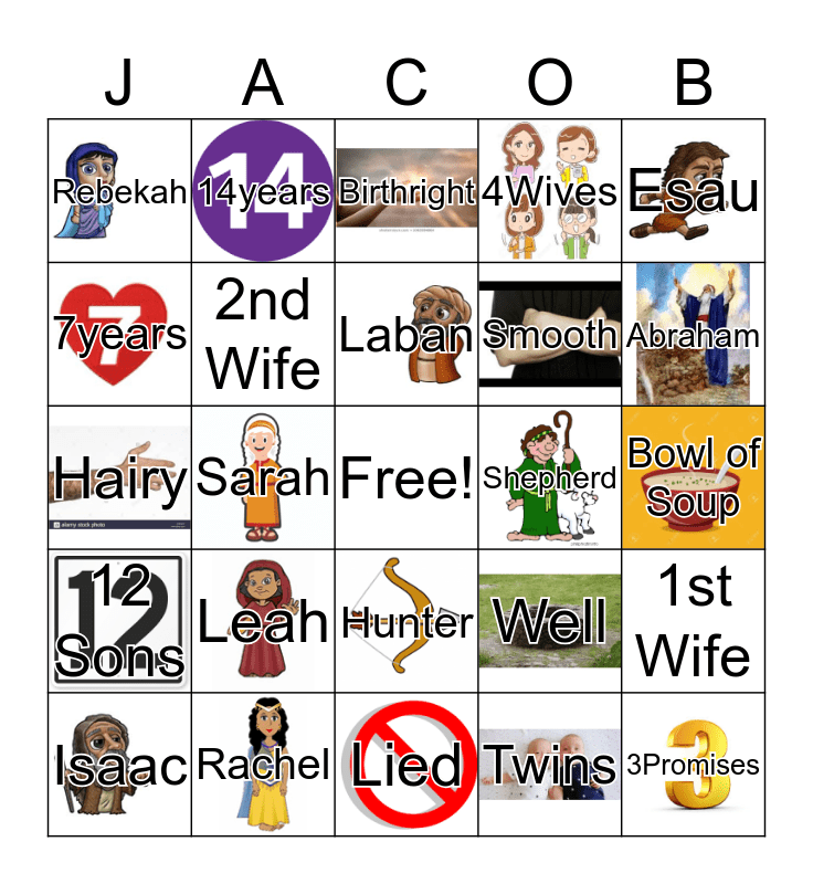 This bingo card has 22 images, a free space and 24 words: Leah, Rachel, Laban, Isaac, Esau, Rebekah, 7years, 14years, Shepherd, Hunter, Smooth, Hairy, Well, 1st Wife, 2nd Wife, Twins, Bowl of Soup, Birthright, Abraham, Sarah, 3Promises, 12 Sons, 4Wives and Lied.