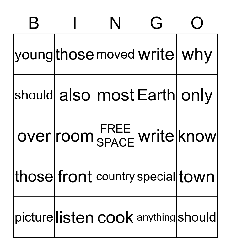This bingo card has a free space and 24 words: front, listen, most, picture, why, young, should, those, write, country, Earth, over, special, town, also, anything, know, moved, only, room, should, those, write and cook.