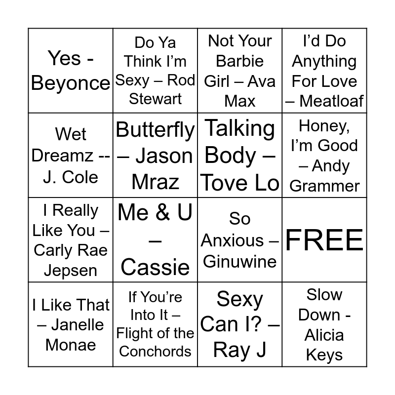 This bingo card has 16 words: If You’re Into It – Flight of the Conchords, FREE, Not Your Barbie Girl – Ava Max, Yes - Beyonce, I Really Like You – Carly Rae Jepsen, Do Ya Think I’m Sexy – Rod Stewart, So Anxious – Ginuwine, Sexy Can I? – Ray J, Wet Dreamz -- J. Cole, Butterfly – Jason Mraz, I Like That – Janelle Monae, I’d Do Anything For Love – Meatloaf, Me & U – Cassie, Honey, I’m Good – Andy Grammer, Talking Body – Tove Lo and Slow Down - Alicia Keys.