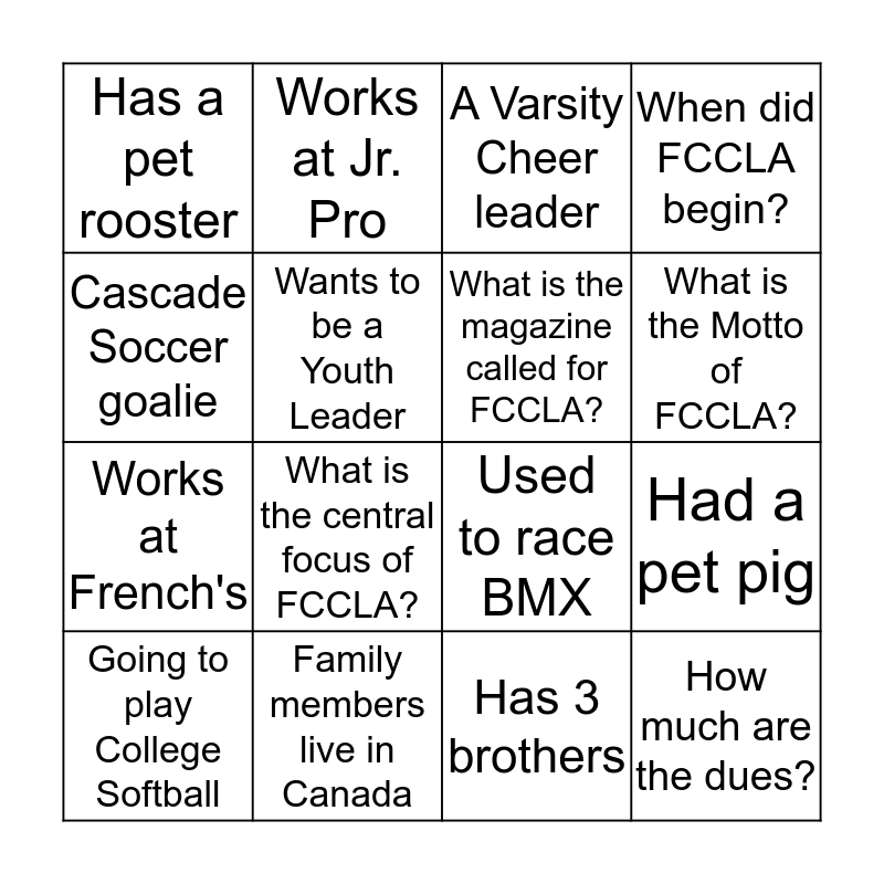 This bingo card has 16 words: Family members live in Canada, Had a pet pig, A Varsity Cheer leader, Has a pet rooster, Works at French's, Works at Jr. Pro, Used to race BMX, Has 3 brothers, Cascade Soccer goalie, Wants to be a Youth Leader, Going to play College Softball, When did FCCLA begin?, What is the central focus of FCCLA?, What is the Motto of FCCLA?, What is the magazine called for FCCLA? and How much are the dues?.
