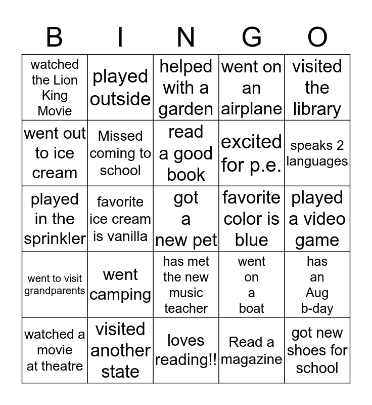This bingo card has a free space and 24 words: went camping, visited another state, read a good book, watched a movie at theatre, visited the library, watched the Lion King Movie, went out to ice cream, played outside, favorite color is blue, has met the new music teacher, excited for p.e., played in the sprinkler, went on a boat, has an Aug b-day, Missed coming to school, Read a magazine, played a video game, helped with a garden, speaks 2 languages, favorite ice cream is vanilla, got new shoes for school, went to visit grandparents, went on an airplane and loves reading!!.