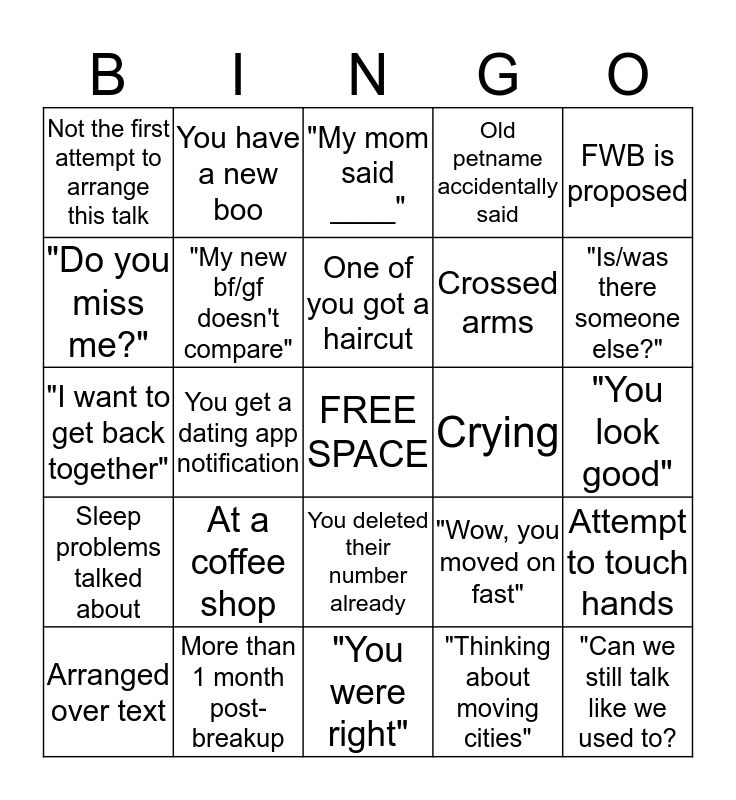 This bingo card has a free space and 24 words: At a coffee shop, More than 1 month post-breakup, One of you got a haircut, Arranged over text, FWB is proposed, Not the first attempt to arrange this talk, "Do you miss me?", You have a new boo, Crying, You deleted their number already, Crossed arms, "I want to get back together", "Wow, you moved on fast", Attempt to touch hands, "My new bf/gf doesn't compare", "Thinking about moving cities", "You look good", "My mom said ____", "Is/was there someone else?", You get a dating app notification, "Can we still talk like we used to?, Sleep problems talked about, Old petname accidentally said and "You were right".