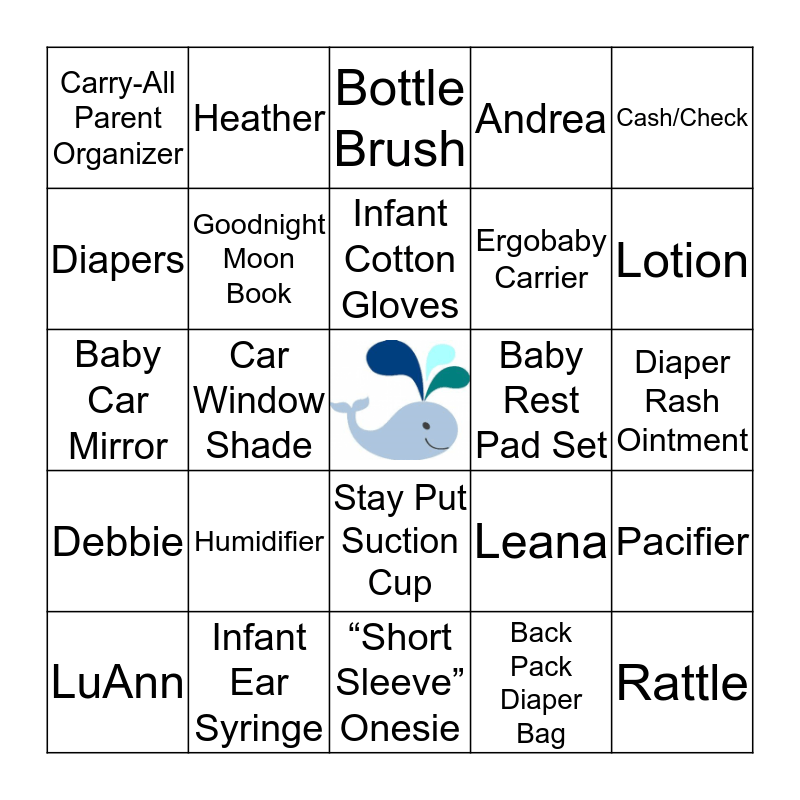 This bingo card has a free space and 87 words: Burp Cloth, Stroller Hooks, Stay Put Suction Cup, Gray Circles Fleece Blanket, Ear Thermom-eter, Bib, Ann, Shampoo, Sandals, Sweatshirt w/zipper, Gift Card, "Long sleeve" Onesie, Pacifier, Diaper Rash Ointment, Swaddleme, Infant Cotton Gloves, Mittens, Toy Car, "Footed" Sleeper, Nursing Pillow, Stephanie, Stuffed Toy, Baby Car Mirror, Baby Scale, Back Pack Diaper Bag, Hat, Teething Ring, Ana, Plug-in Night Light, Kelsey, Infant Ear Syringe, Sign Language Flash Cards, Wash Cloths, Humidifier, Diapers, LaVonne, Lotion, Fitted Crib Sheet, Pacifier Clip, Car Window Shade, Moccasins, Chris, My First Soft Book Set, Baby Rest Pad Set, Bottles, Cash/Check, Nail Clipper Set, Heather, Changing Pad Cover, Brown Bear, Brown Bear Book, Baby Powder, Minnie, Debbie, Nursing Cover, Evelyn, Baby Wipes, Ergobaby Carrier, Diaper Pail, Baby Spoon, Andrea, Goodnight Moon Book, Portable Diaper Changing Pad, Picture Frame, Baby Hooded Towel, Where’s Spot Book, Lorna, Nicole, LuAnn, Rattle, Baby Bath Tub, Yellow Rubber Ducky, Sleeper “Gown”, Bottle Brush, Leana, Breast Pump, Wall Decoration, Rosa, “Short Sleeve” Onesie, Q-tips, Dianne, Baby Swing, Analis, Walker, The Rainbow Fish Book, Drying Rack, Carry-All Parent Organizer and Sabrina.