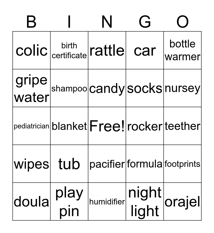 This bingo card has a free space and 29 words: doula, onsie, blanket, wash cloths, colic, rattle, shampoo, tub, rocker, play pin, teether, orajel, humidifier, night light, nursey, pampers, pacifier, wipes, bottle warmer, pediatrician, formula, mittens, socks, gripe water, car, birth certificate, footprints, candy and silver teeth.