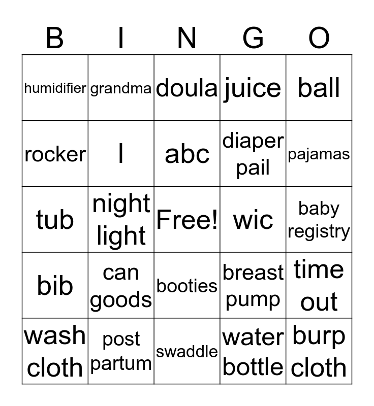 This bingo card has a free space and 29 words: wash cloth, wipes, night light, bib, humidifier, doula, l, can goods, wic, post partum, baby registry, burp cloth, swaddle, water bottle, pajamas, baby monitor, booties, bib, ball, tub, breast pump, robe, diaper pail, rocker, juice, grandma, time out, abc and toys.