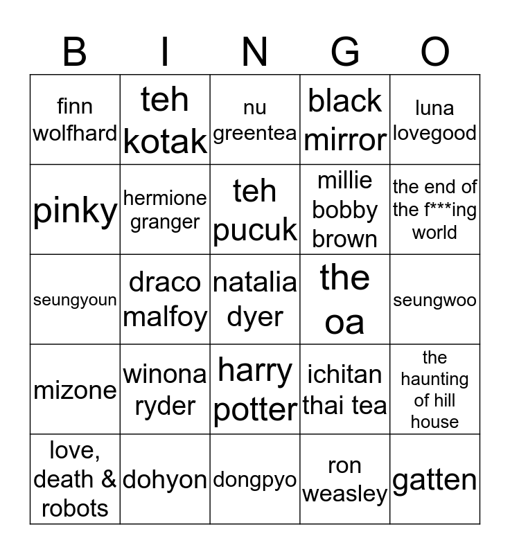 This bingo card has 25 words: winona ryder, dongpyo, teh pucuk, love, death & robots, luna lovegood, finn wolfhard, pinky, teh kotak, the oa, harry potter, millie bobby brown, seungyoun, ichitan thai tea, the haunting of hill house, hermione granger, gatten, seungwoo, nu greentea, the end of the f***ing world, draco malfoy, natalia dyer, dohyon, mizone, black mirror and ron weasley.
