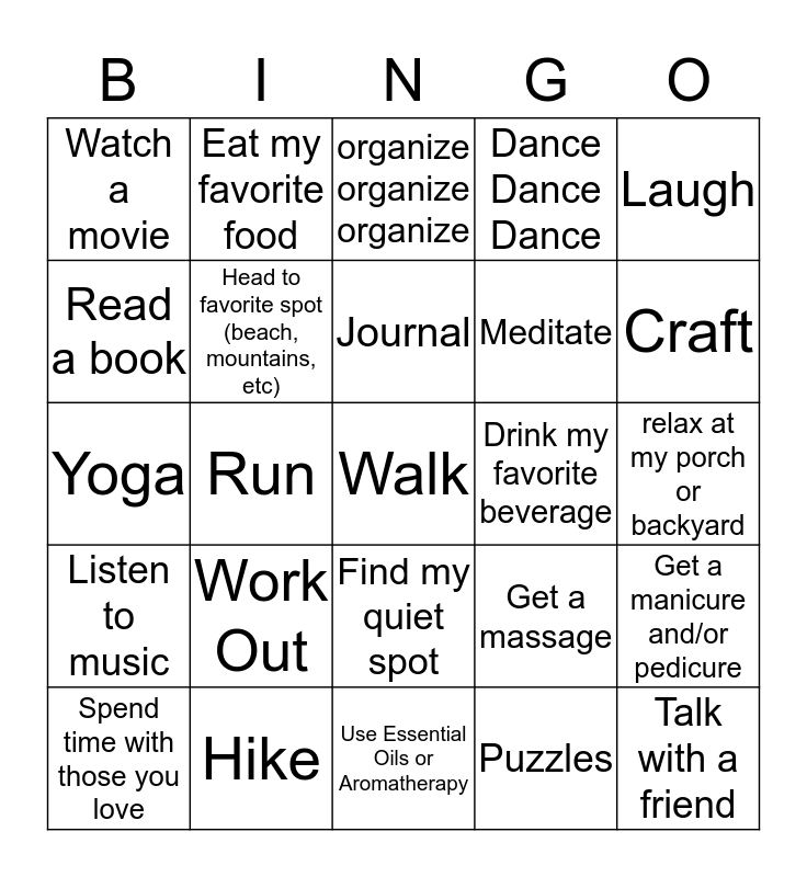 This bingo card has 25 words: Work Out, Use Essential Oils or Aromatherapy, Journal, Spend time with those you love, Laugh, Watch a movie, Read a book, Eat my favorite food, Drink my favorite beverage, Find my quiet spot, Meditate, Yoga, Get a massage, Get a manicure and/or pedicure, Head to favorite spot (beach, mountains, etc), Talk with a friend, relax at my porch or backyard, organize organize organize, Craft, Run, Walk, Hike, Listen to music, Dance Dance Dance and Puzzles.