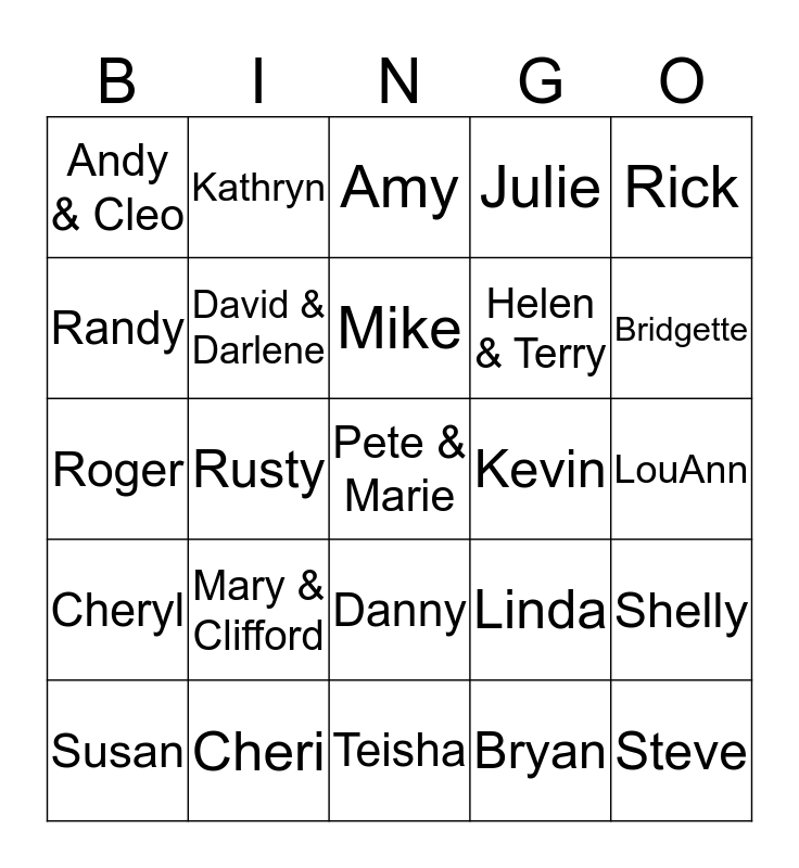 This bingo card has a free space and 24 words: Mary & Clifford, Cheri, Mike, Susan, Rick, Andy & Cleo, Randy, Kathryn, Kevin, Danny, Helen & Terry, Roger, Linda, Shelly, David & Darlene, Bryan, LouAnn, Amy, Bridgette, Rusty, Steve, Cheryl, Julie and Teisha.