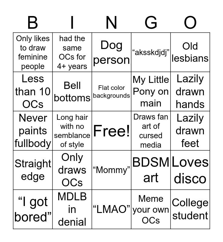 This bingo card has a free space and 24 words: Only draws OCs, MDLB in denial, Flat color backgrounds, “I got bored”, Old lesbians, Only likes to draw feminine people, Less than 10 OCs, had the same OCs for 4+ years, Draws fan art of cursed media, “Mommy”, My Little Pony on main, Never paints fullbody, BDSM art, Loves disco, Bell bottoms, Meme your own OCs, Lazily drawn feet, Dog person, Lazily drawn hands, Long hair with no semblance of style, College student, Straight edge, “aksskdjdj” and “LMAO”.