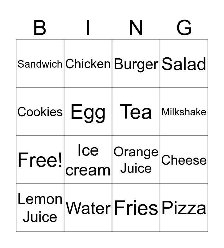 This bingo card has 20 words: Cheese, Coffee, Burger, Coconut Milk, Lemon Juice, Cookies, Water, Sandwich, Free!, Chicken, Ice cream, Orange Juice, Egg, Pizza, Tea, Cola, Milkshake, Salad, Fries and Beef.