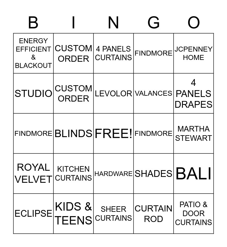 This bingo card has a free space and 24 words: KITCHEN CURTAINS, KIDS & TEENS, LEVOLOR, ECLIPSE, JCPENNEY HOME, ENERGY EFFICIENT & BLACKOUT, STUDIO, CUSTOM ORDER, FINDMORE, HARDWARE, VALANCES, FINDMORE, SHADES, BALI, CUSTOM ORDER, CURTAIN ROD, MARTHA STEWART, 4 PANELS CURTAINS, 4 PANELS DRAPES, BLINDS, PATIO & DOOR CURTAINS, ROYAL VELVET, FINDMORE and SHEER CURTAINS.