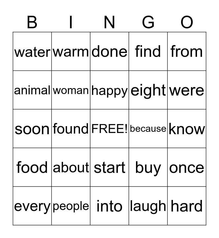 This bingo card has a free space and 24 words: about, people, happy, every, from, water, animal, warm, because, start, eight, soon, buy, once, woman, laugh, know, done, were, found, hard, food, find and into.