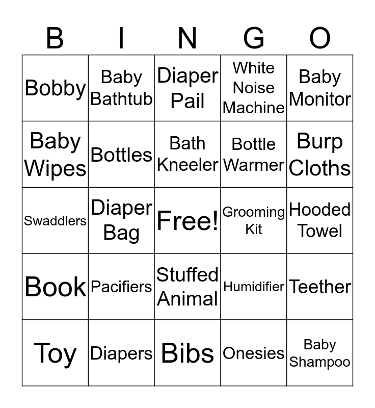 This bingo card has a free space and 24 words: Pacifiers, Diapers, Bath Kneeler, Toy, Baby Monitor, Bobby, Baby Wipes, Baby Bathtub, Grooming Kit, Stuffed Animal, Bottle Warmer, Swaddlers, Humidifier, Teether, Bottles, Onesies, Hooded Towel, Diaper Pail, Burp Cloths, Diaper Bag, Baby Shampoo, Book, White Noise Machine and Bibs.