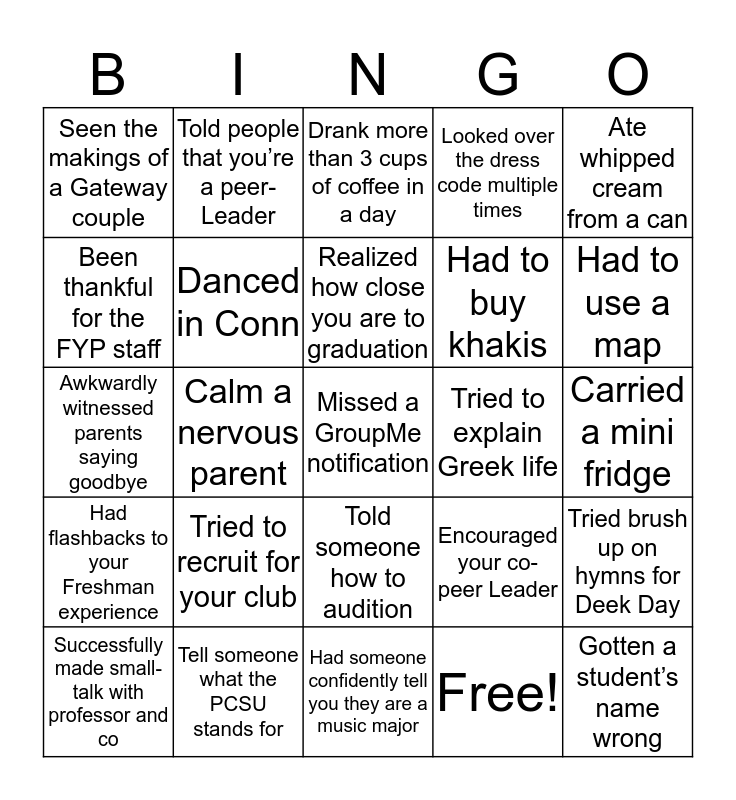 This bingo card has 30 words: Tell someone what the PCSU stands for, Calm a nervous freshman, Calm a nervous parent, Explained the meal plan, Seen the makings of a Gateway couple, Drank more than 3 cups of coffee in a day, Danced in Conn, Told someone how to audition, Tried to explain Greek life, Had someone confidently tell you they are a music major, Carried a mini fridge, Missed a GroupMe notification, Free!, Gotten a student’s name wrong, Had to use a map, Learned the value of a good ice-breaker, Encouraged your co-peer Leader, Had flashbacks to your Freshman experience, Tried to recruit for your club, Ate whipped cream from a can, Awkwardly witnessed parents saying goodbye, Remembered why you came to Lee, Told people that you’re a peer-Leader, Had to buy khakis, Been thankful for the FYP staff, Looked over the dress code multiple times, Tried brush up on hymns for Deek Day, Successfully made small-talk with professor and co, Realized how close you are to graduation and Had to explain Chapel Credit.