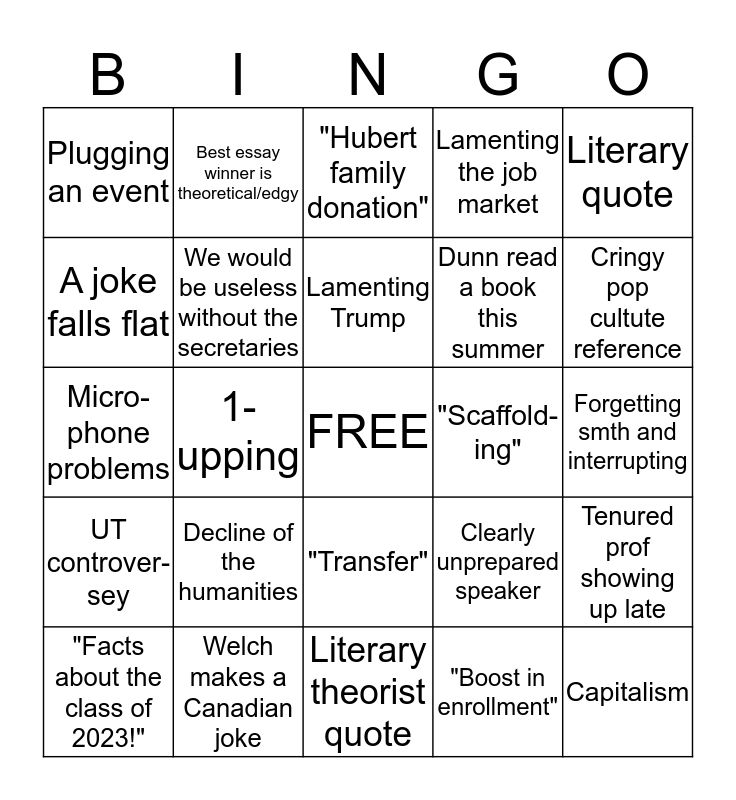 This bingo card has a free space and 24 words: Decline of the humanities, Welch makes a Canadian joke, Lamenting Trump, "Facts about the class of 2023!", Literary quote, Plugging an event, A joke falls flat, Best essay winner is theoretical/edgy, "Scaffold-ing", "Transfer", Dunn read a book this summer, Micro-phone problems, Clearly unprepared speaker, Tenured prof showing up late, We would be useless without the secretaries, "Boost in enrollment", Forgetting smth and interrupting, "Hubert family donation", Cringy pop cultute reference, 1-upping, Capitalism, UT controver-sey, Lamenting the job market and Literary theorist quote.