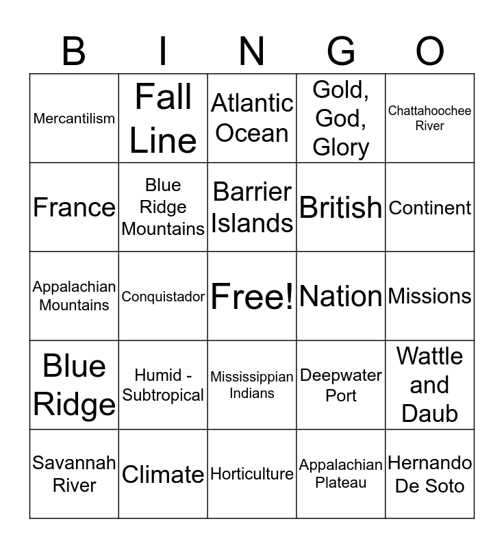 This bingo card has a free space and 34 words: Valley and Ridge, Appalachian Plateau, Piedmont, Coastal Plain, Blue Ridge, Blue Ridge Mountains, Chattahoochee River, Savannah River, Fall Line, Okefenokee Swamp, Barrier Islands, Atlantic Ocean, Hemisphere, Region, Nation, Continent, Climate, Appalachian Mountains, Humid - Subtropical, Deepwater Port, Mississippian Indians, palisades, Mercantilism, Missions, Horticulture, Hernando De Soto, Gold, God, Glory, Spanish, British, France, Mother Country, Conquistador, Wattle and Daub and chiefdoms.