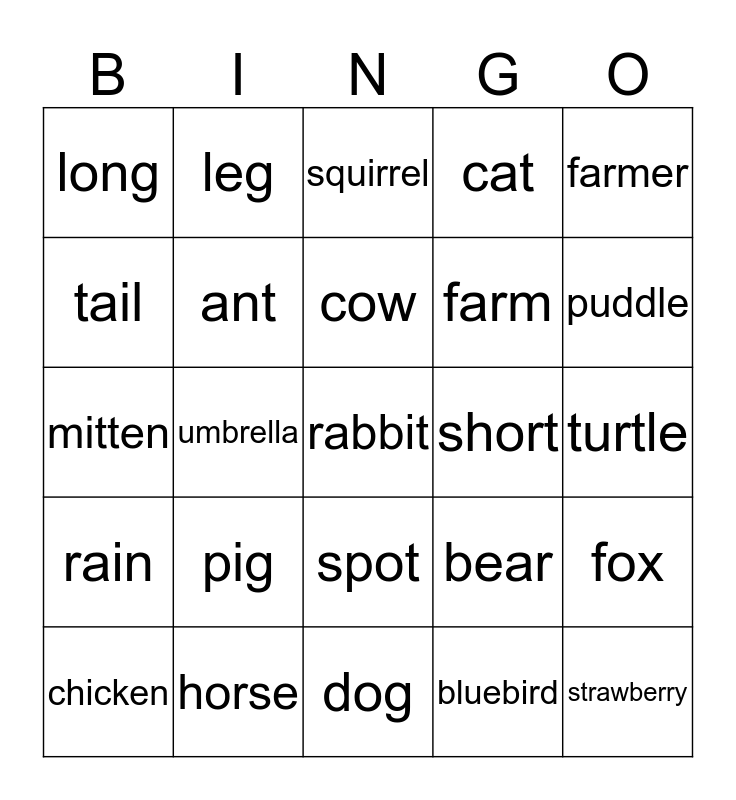 This bingo card has a free space and 24 words: pig, horse, cow, chicken, farmer, long, tail, leg, short, spot, farm, mitten, bear, fox, ant, bluebird, turtle, squirrel, puddle, umbrella, strawberry, rain, cat and dog.