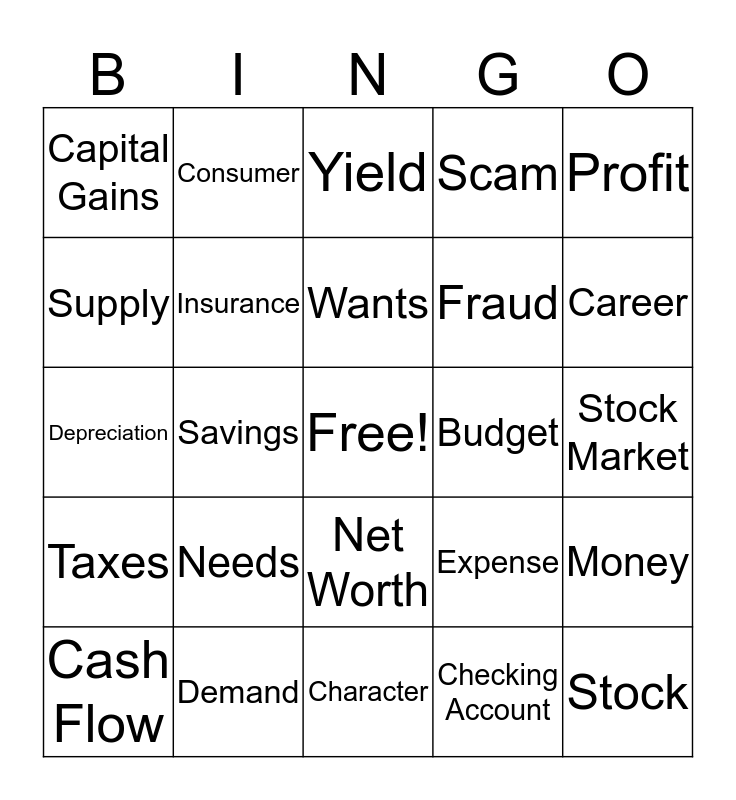 This bingo card has a free space and 37 words: Income, Job, Interest, Insurance, Money, Needs, Wants, Net Income, Profit, Principal, Savings, Scam, Stock, Stock Market, Supply, Taxes, Warranty, Yield, Net Worth, Budget, Capital Gains, Career, Cash Flow, Character, Check, Checking Account, Consumer, Credit, Credit Card, Credit Score, Debt, Demand, Depreciation, Deductible, Expense, Fraud and Goal.
