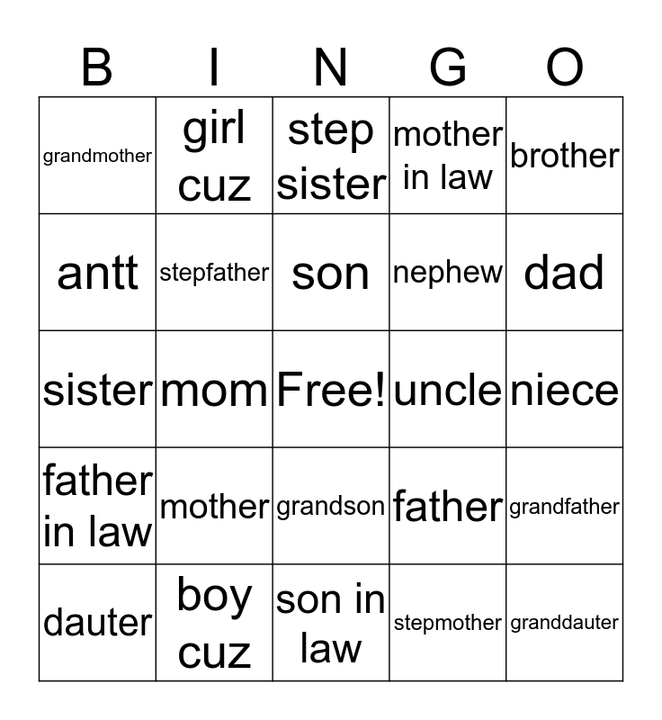 This bingo card has a free space and 24 words: mother, boy cuz, son, dauter, brother, grandmother, antt, girl cuz, uncle, grandson, nephew, sister, father, grandfather, stepfather, stepmother, niece, step sister, dad, mom, granddauter, father in law, mother in law and son in law.