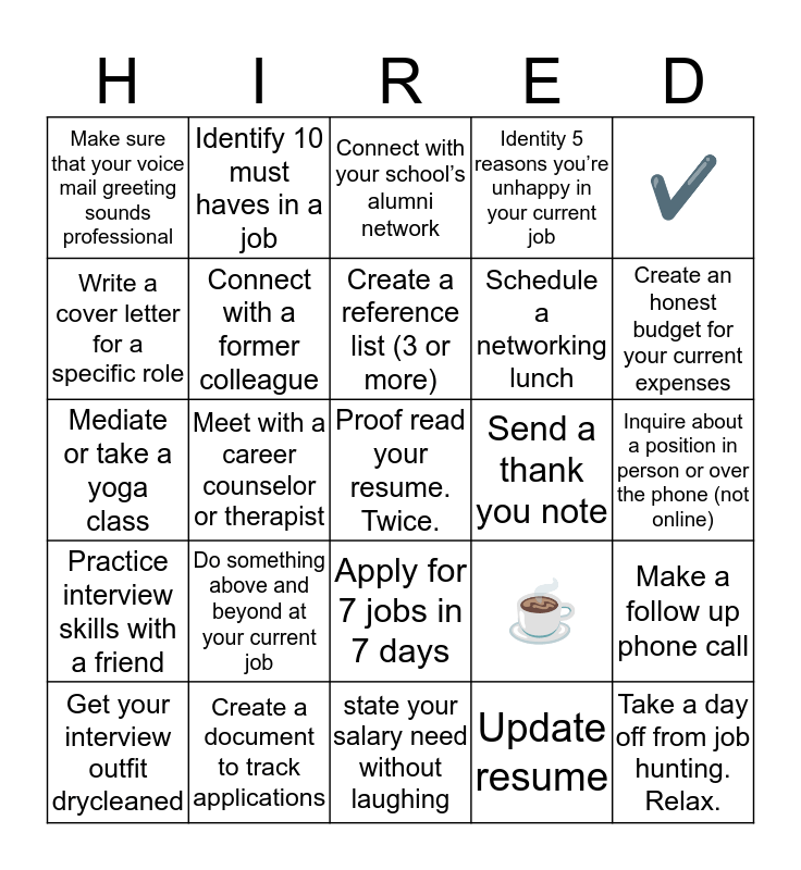 This bingo card has 28 words: Make a follow up phone call, Apply for a job that feels like a reach, Schedule a networking lunch, Update resume, Write a cover letter for a specific role, Connect with your school’s alumni network, Identify 10 must haves in a job, Practice interview skills with a friend, Send a thank you note, Get your interview outfit drycleaned, Mediate or take a yoga class, Identity 5 reasons you’re unhappy in your current job, Create a document to track applications, state your salary need without laughing, Create an honest budget for your current expenses, Schedule your first interview, Do something above and beyond at your current job, Connect with a former colleague, Create a reference list (3 or more), Apply for 7 jobs in 7 days, Make sure that your voice mail greeting sounds professional, Take a day off from job hunting. Relax., Proof read your resume. Twice., Meet with a career counselor or therapist, Inquire about a position in person or over the phone (not online), ☕️, ✔️ and ☎️.