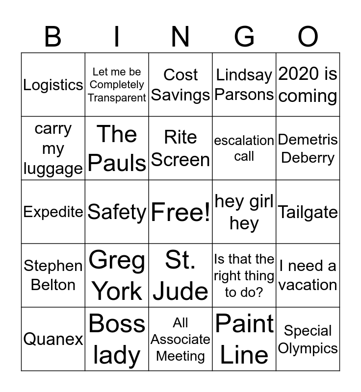 This bingo card has a free space and 44 words: What's the Delta?, Special Olympics, boss is on "vacation", Quanex, Think Differently, Paint Line, Cost Savings, Lets get creative, 2020 is coming, Boss lady, Lindsay Parsons, hey girl hey, St. Jude, Greg York, Take Action, All Associate Meeting, Intek, Expedite, Bye Felicia, Demetris Deberry, Let me be Completely Transparent, 5K, thought about calling in sick tom, Logistics, Mike Enochs, Tailgate, round me out, you got 2 seconds, Is that the right thing to do?, Stephen Belton, Believe its possible, I need a vacation, tug a war, National Night Out, Safety, BOO, Neal Neal, Past Due's, Rite Screen, carry my luggage, escalation call, Fiesta Day, The Pauls and chik fil a.