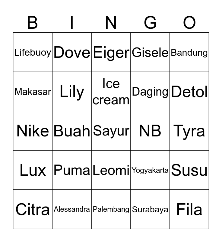 This bingo card has a free space and 24 words: Puma, Alessandra, Ice cream, Citra, Bandung, Lifebuoy, Makasar, Dove, NB, Leomi, Daging, Nike, Yogyakarta, Susu, Lily, Surabaya, Tyra, Eiger, Detol, Buah, Fila, Lux, Gisele and Palembang.