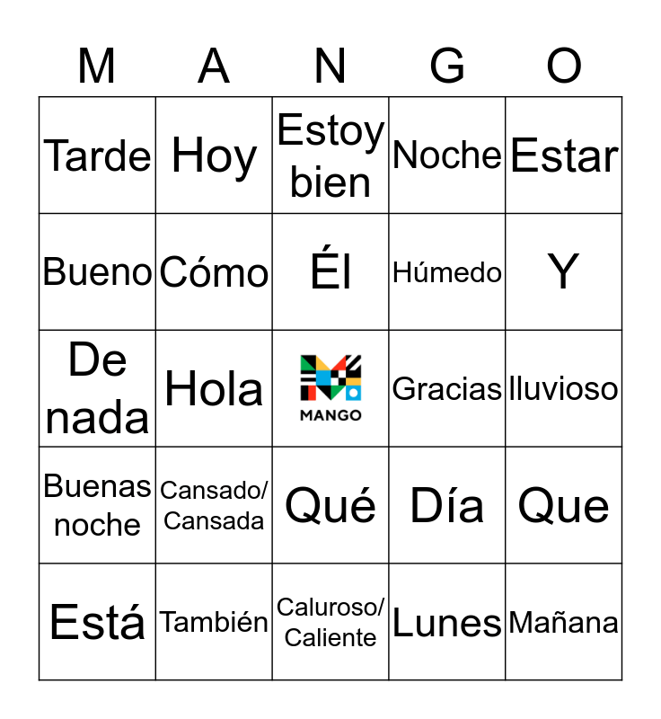 This bingo card has a free space and 33 words: ¿Como Estás?, Buenos días, Hola, Buenas tardes, Buenas noche, Cómo, Estar, Está, Hoy, Ella, Él, Estoy bien, Yo, Estoy, Gracias, Y, También, De nada, Cansado/ Cansada, Día, Qué, Frío, Tarde, lluvioso, Caluroso/ Caliente, Mañana, Noche, Húmedo, Bueno, Que, Tener, Lunes and Igualmente.