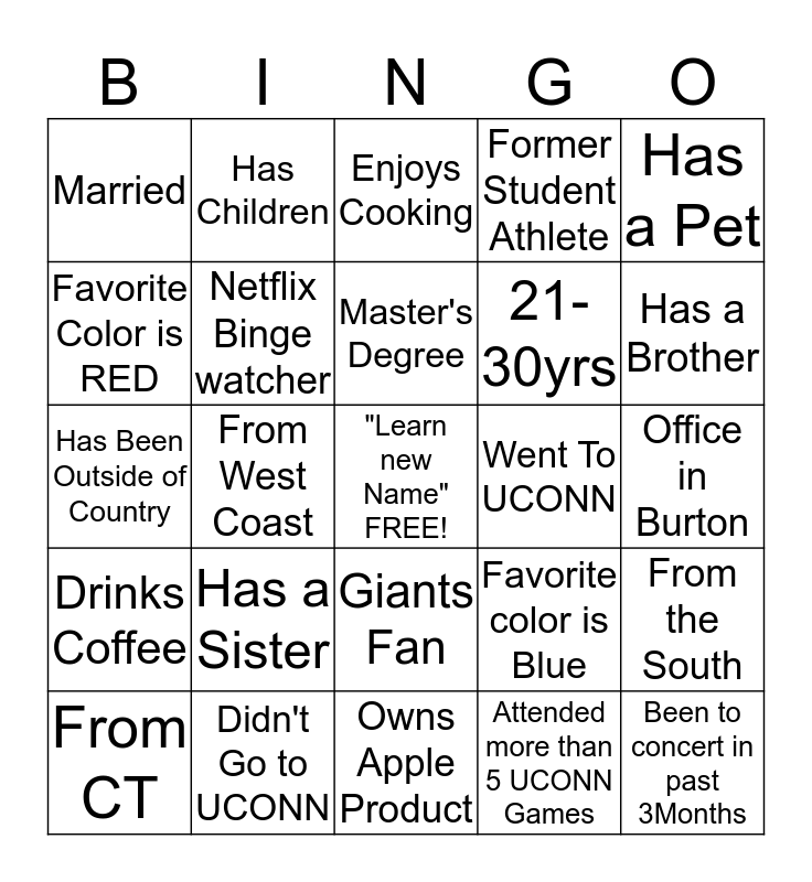 This bingo card has a free space and 24 words: From CT, Has a Sister, Master's Degree, Attended more than 5 UCONN Games, Has a Pet, Married, Has Children, Enjoys Cooking, Went To UCONN, Office in Burton, Has Been Outside of Country, Netflix Binge watcher, Favorite color is Blue, From the South, Favorite Color is RED, Didn't Go to UCONN, Owns Apple Product, Former Student Athlete, Has a Brother, Drinks Coffee, From West Coast, Giants Fan, 21-30yrs and Been to concert in past 3Months.