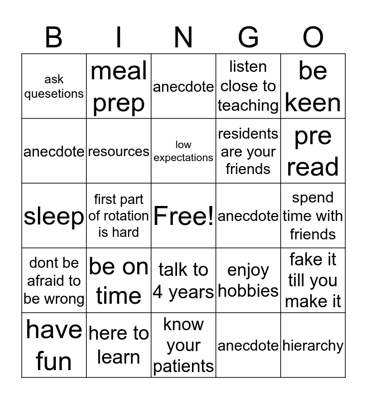 This bingo card has a free space and 24 words: be on time, here to learn, low expectations, have fun, be keen, ask quesetions, anecdote, meal prep, anecdote, talk to 4 years, residents are your friends, sleep, enjoy hobbies, fake it till you make it, resources, anecdote, spend time with friends, anecdote, pre read, first part of rotation is hard, hierarchy, dont be afraid to be wrong, listen close to teaching and know your patients.